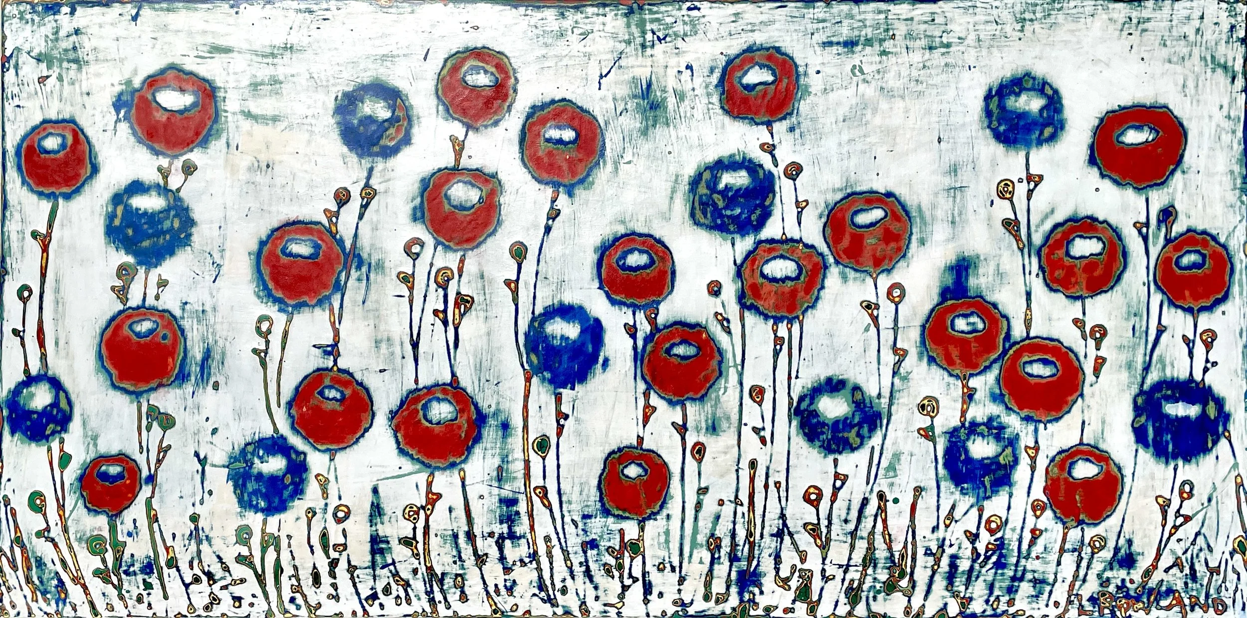 Leslie is inspired by exploring new subjects in her work while blending science and art. There are several series represented in her body of work. Paintings in the “Ecological Stories” series depict intricate connections found I the natural world. The “Binary Code Mantras” series offers messages written in binary code such as “You are Beautiful,” “You’ve Got This,” and “Fuck It; Let’s Dance” The “Music Sound Waves” series presents interpretations of actual music waveforms derived from individual songs ranging from monks chanting “Om” to rock-n -roll.